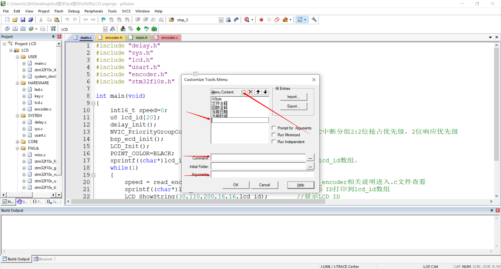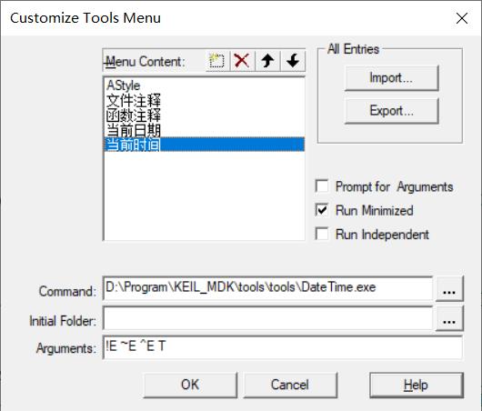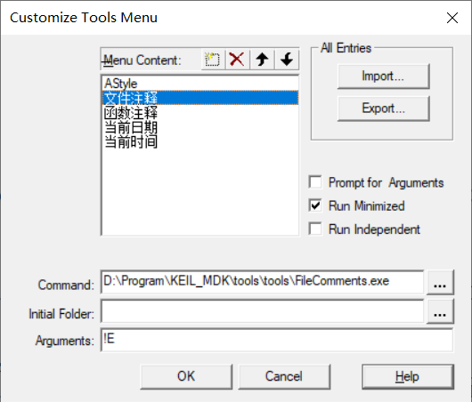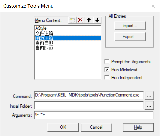 Keil使用相关 添加插件¶ 选择用户自定义工具栏设置 新建一个插件名,需要选择插件路径,还有实现代码,可以根据后面几步填写,路径自己选好 格式化文档¶ -n "$E*.c" "$E*.h" 文件注释¶ !E 函数注释¶ !E ~E 插入当前日期¶ !E ~E ^E 插入当前时间¶ !E ~E ^E T 修改注释文件¶ 修改文件注释以及函数注释格式,在Tool中修改以下文件格式即可,File.c是文件注释的格式,function是函数的注释格式。 配置虚拟串口¶ 下载虚拟串口软件 建立一个ini文件,放入下面的代码,COM2就是要使用的串口,S1IN代表串口1 MODE COM2 115200,0,8,1 ASSIGN COM2 < S1IN > S1OUT