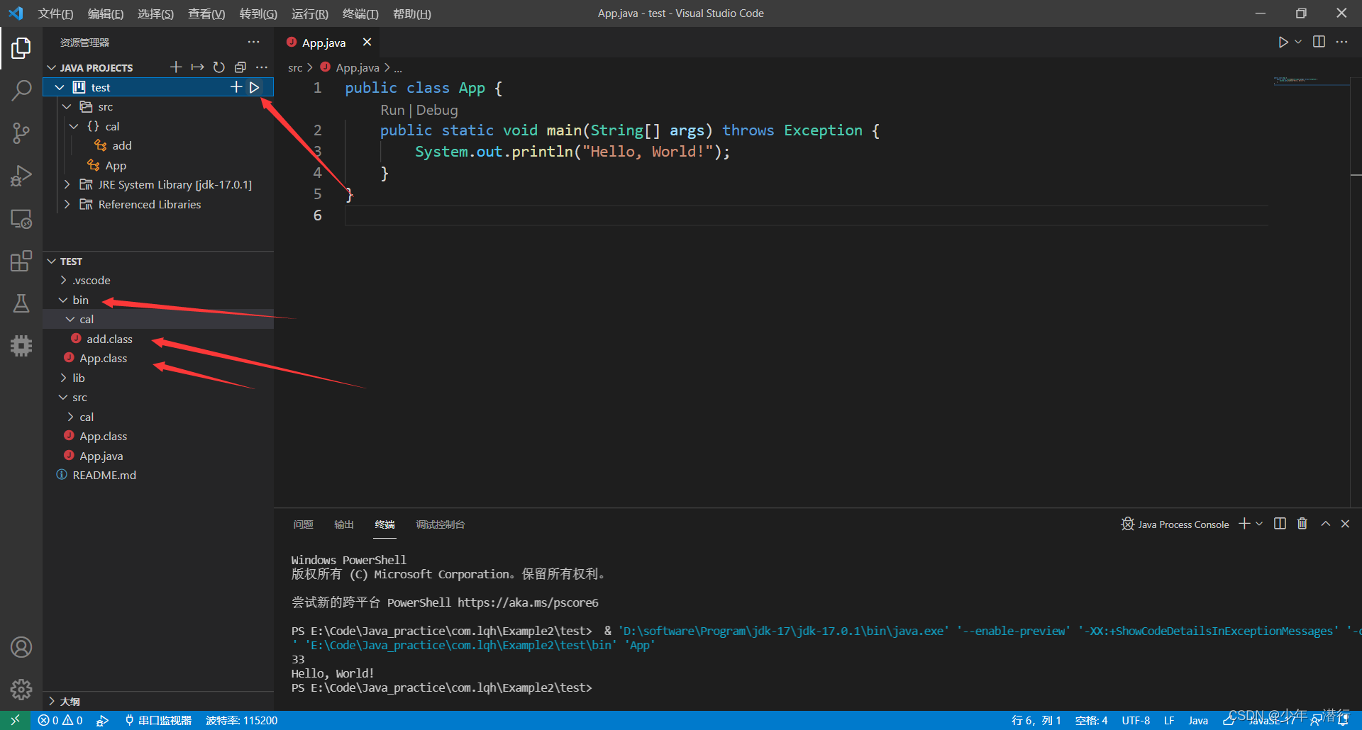 5、点击里面的运行。class文件的保存位置就会在bin目录下,src目录下就不会有,但是我这里已经用code run生成了。