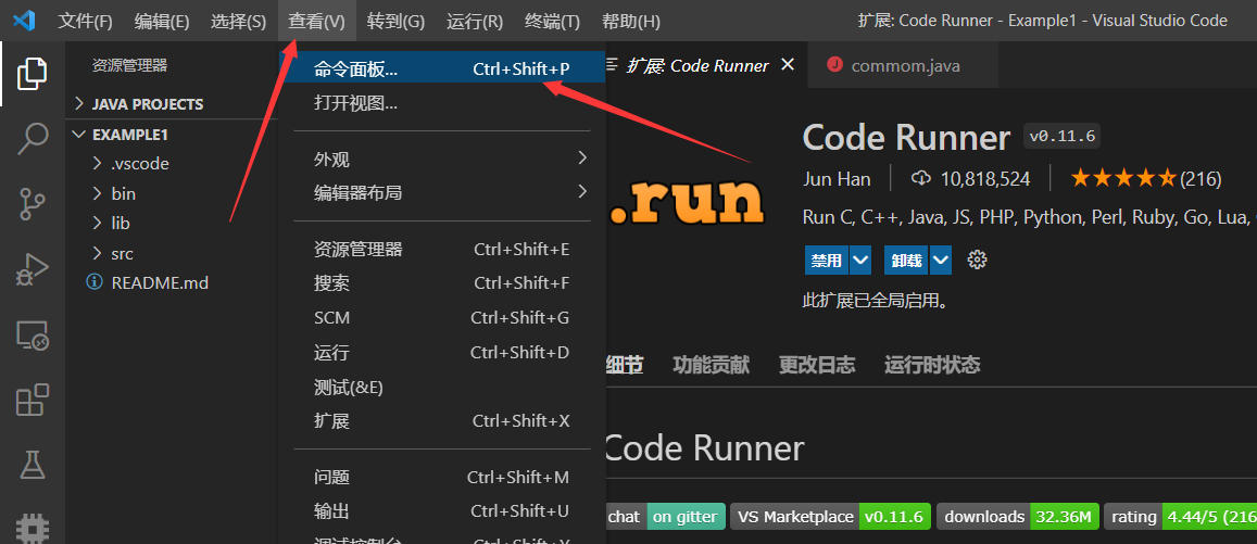 2、点击命令面板,也可以ctrl+shift+p