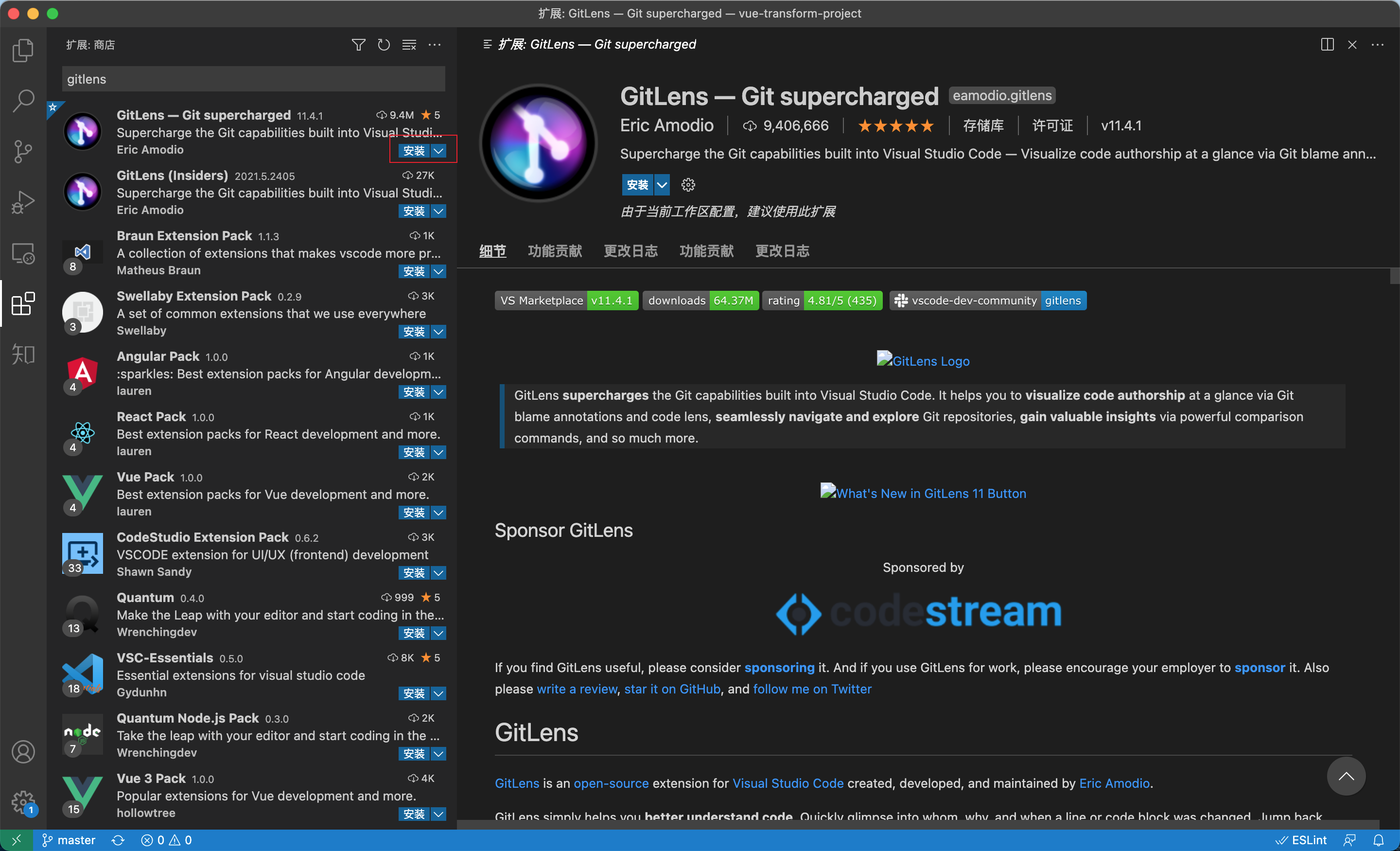 补充2:有些朋友点开分支管理发现没有 file histroy/commits 之类的增强功能,我疏忽了,这个需要安装一个 vscode 必备插件 Gitlens,安装方法如图:https://img.alicdn.com/imgextra/i3/O1CN01JxtnGQ1gd9u3aZ3JZ_!!6000000004164-2-tps-2880-1750.png