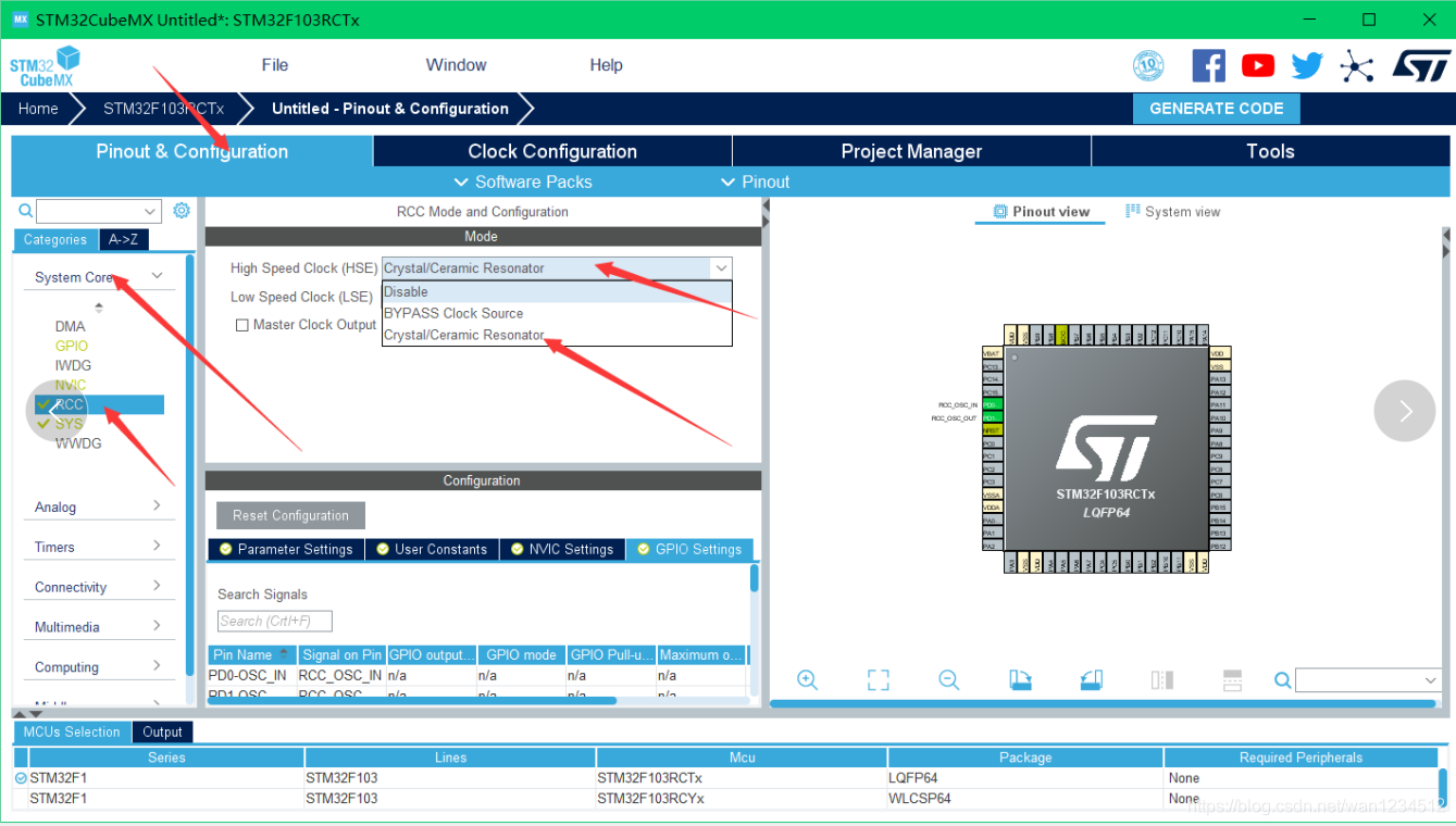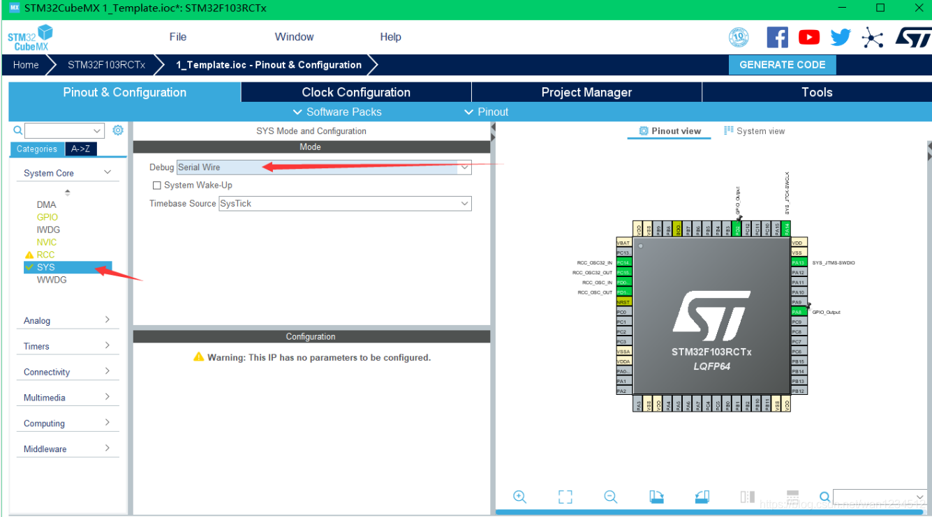 5、先选择打开外部高速时钟,也可选上外部低速时钟,在SYS中DEBUG选择打开SW模式,一定要选一个模式,不然可能会下载一次代码后将芯片锁死。