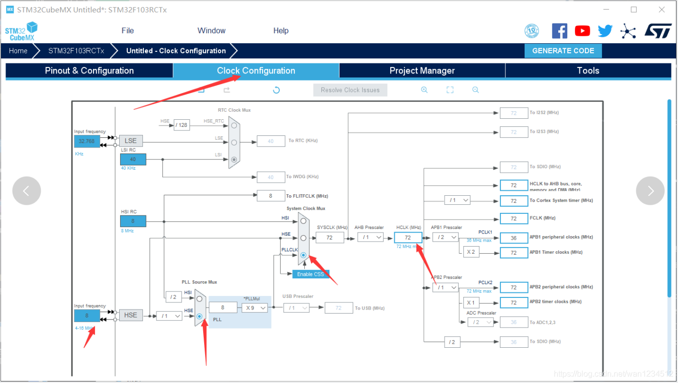 6、在时钟配置模块根据实际情况配置自己想要的时钟。