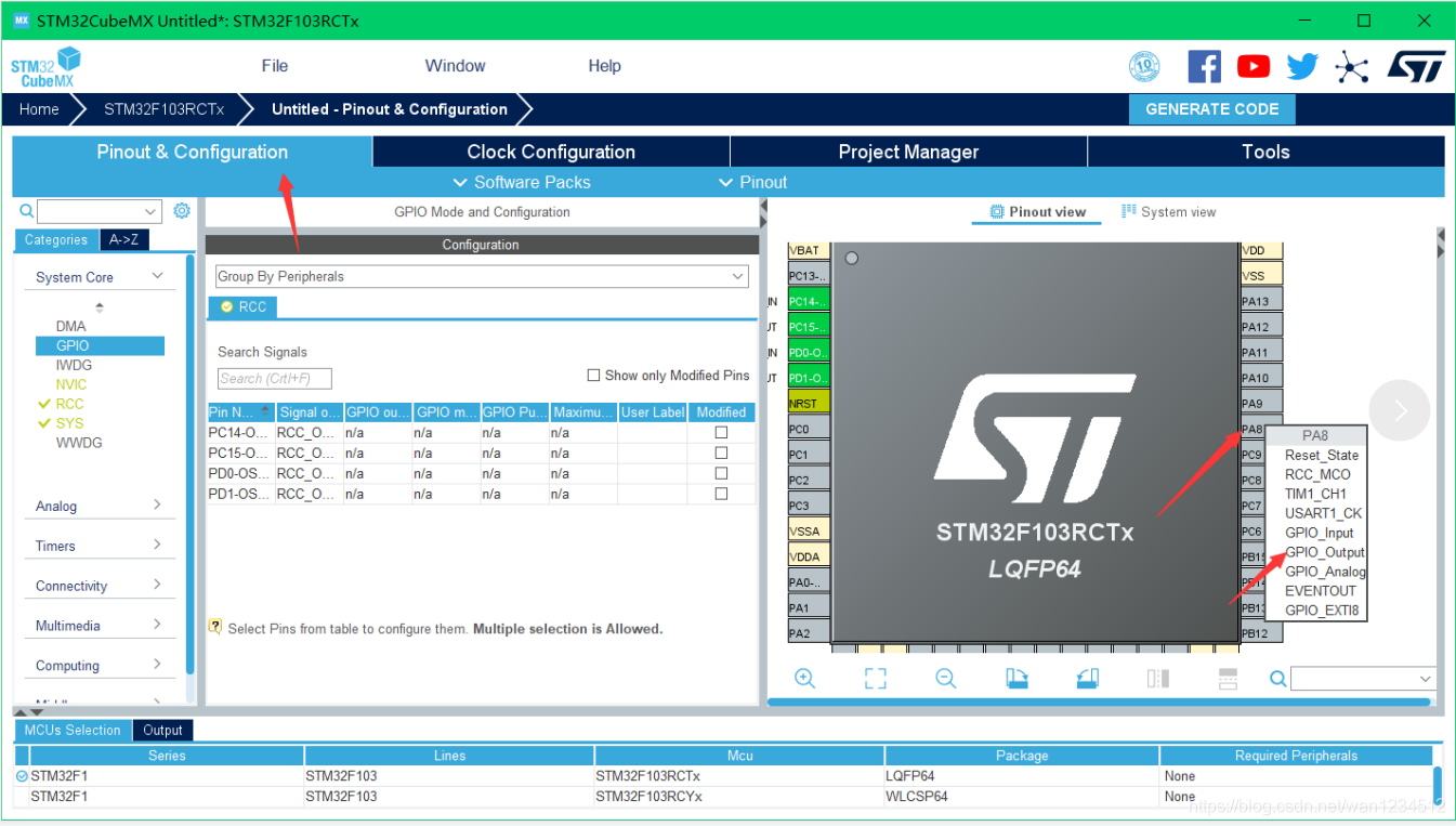 7、点击PA8,选择GPIO_Output模式(IO口输出模式),PD2同理