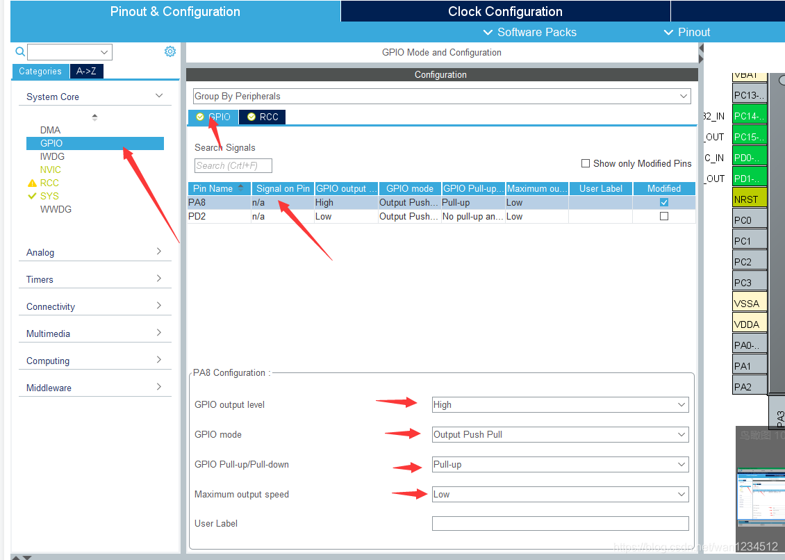 8、点击PA8,将默认输出电平置高,模式设置为推挽输出模式,引脚上拉,输出速度低,PD2配置同理(GPIO属性配置应根据板子实际情况)