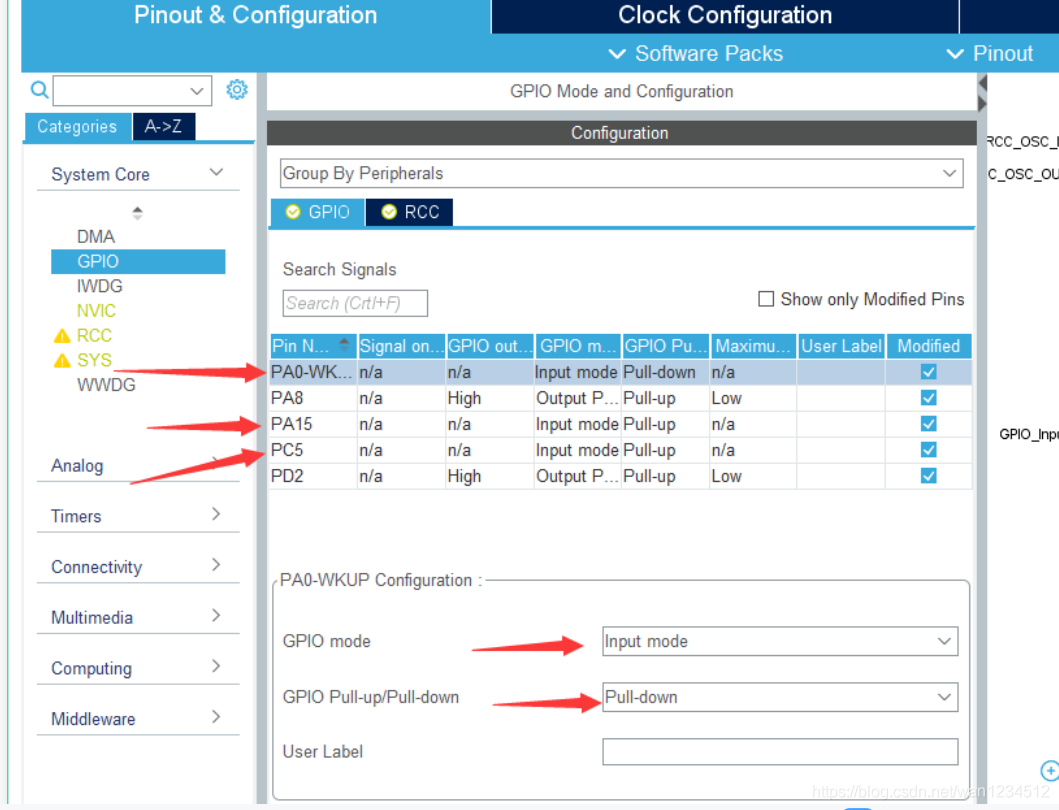 1、点击PA0,选择GPIO_Input,PC5,PA15同理。