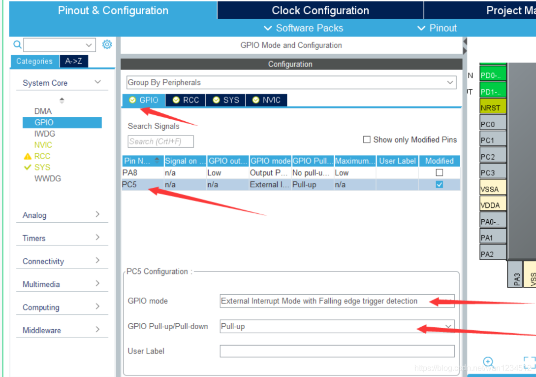 3、点击PC5,配置模式为外部中断下降沿触发。内部上拉