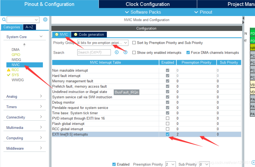 5、在NVIC界面,选择分组方式,以及配置优先级,注意配置优先级的时候,尽量大于0,不然可能因为中断中用HAL_Delay()卡死所有配置完成后,生成代码