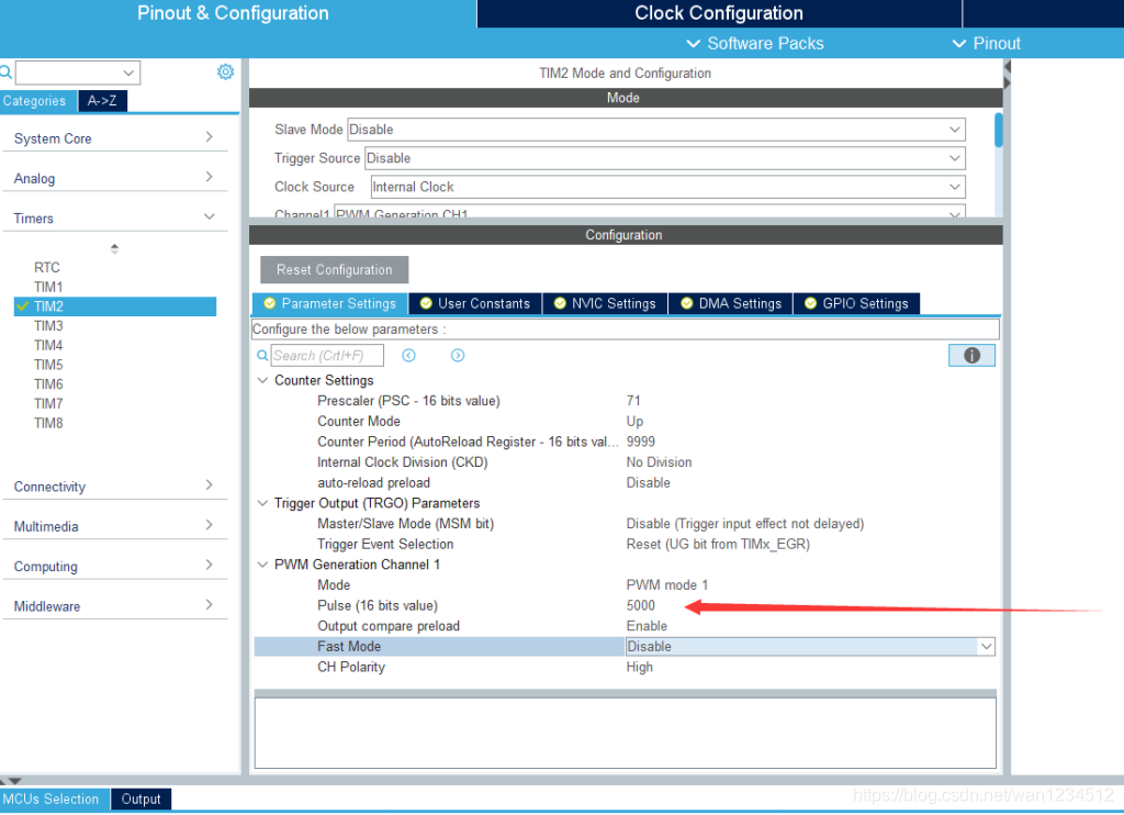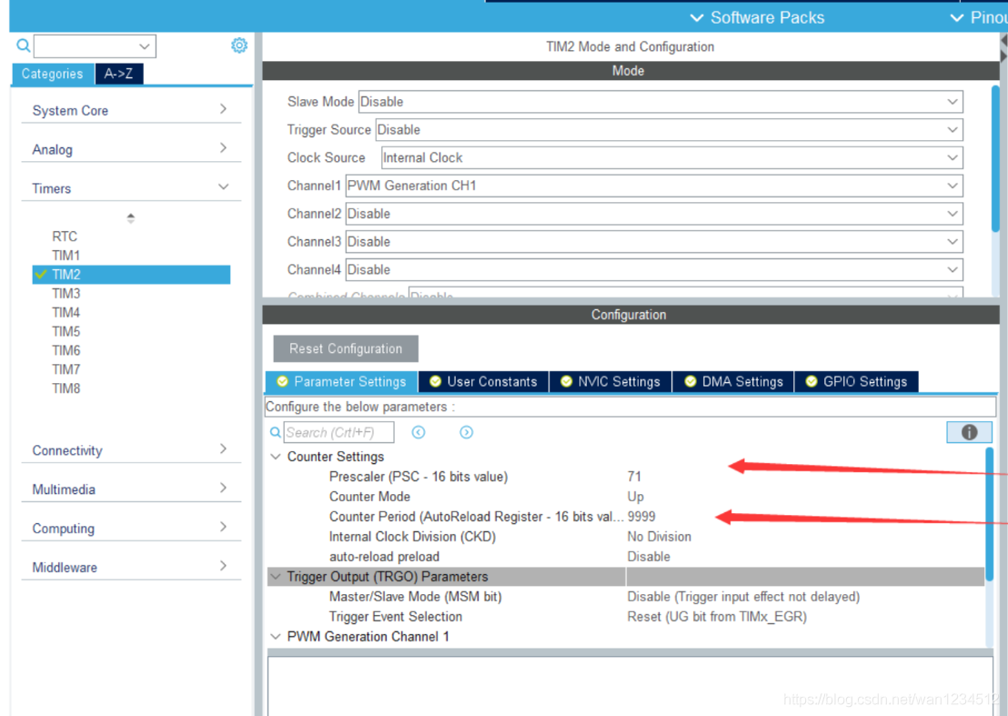 2、选择分频系数为71,计数值为9999,则产生的PWM波周期为 (71+1)*(9999+1)/72000000=10ms,为100Hz
