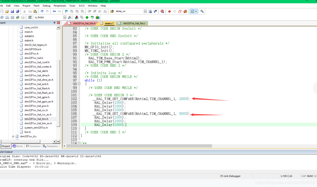 说明:有时候程序下载后不实现,可试着复位一下,也可在魔术棒配置中打开下载后复位。 (仅仅写了PWM配置部分,其余初始化以及工程配置未做说明)
