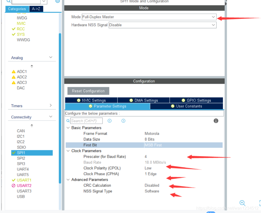 1、打开SPI1,选择全双工模式,MSB先行,时钟分频任意,只要不超过18M即可,选择软件触发
