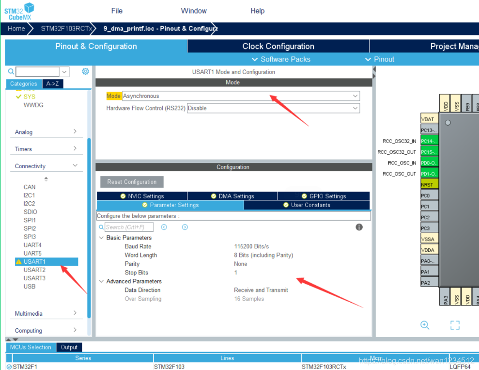 实现功能:用DMA将内存数据转到串口1输出寄存器,并进行输出