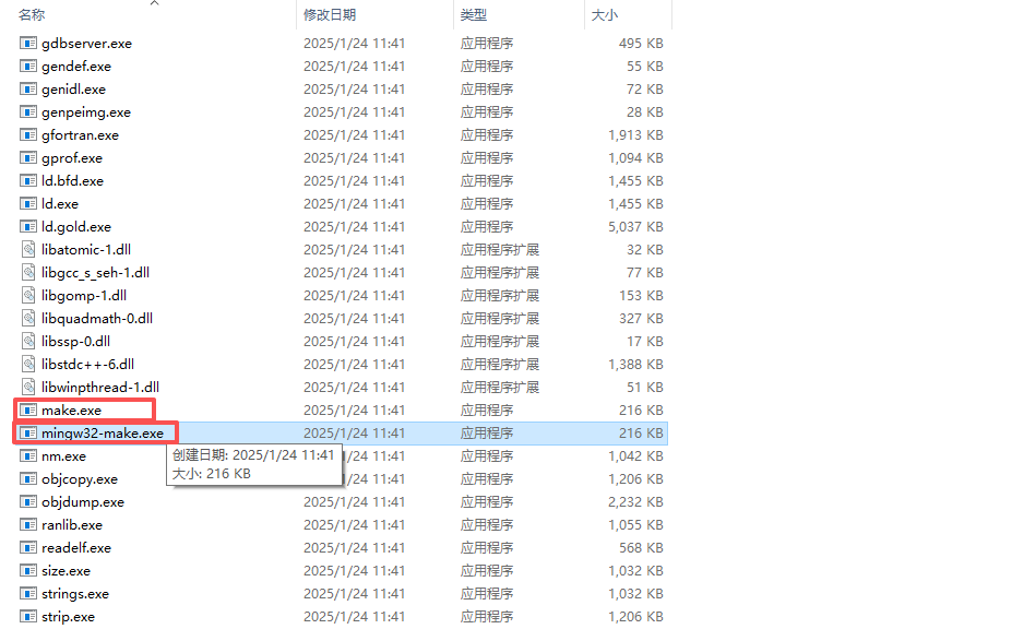 然后,为了方便使用make。我一般会把mingw64/bin,中的 mingw32-make 复制并重命名一份 make。