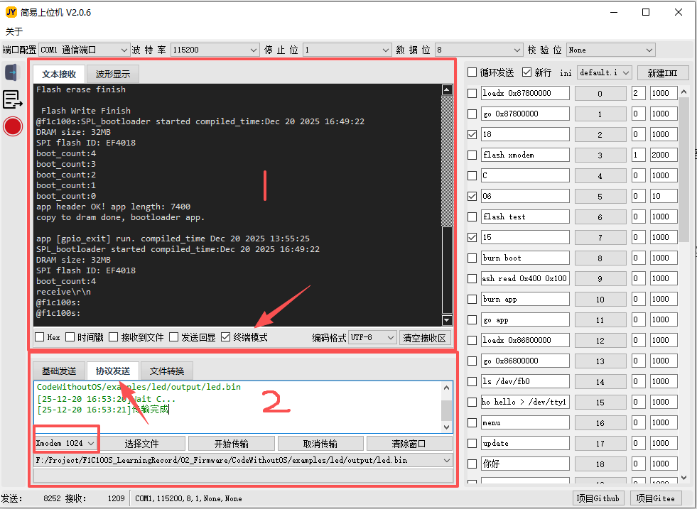 | 我这里做一个简要的描述。在文本接收中,如果你想要可输入,把终端模式勾上,如果只是想看输出,就取消。然后在协议发送中,选择Xmodem 协议,然后选择指定的文件发送。 |