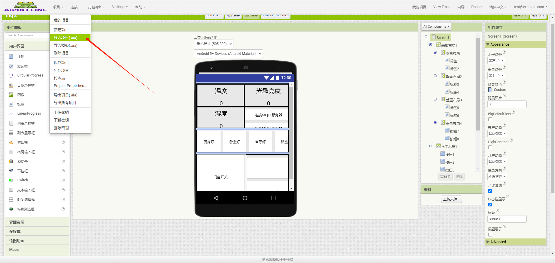 使用APPINVENTOR搭建一个简易的APP模型。在APPINVENTOR中导入 mqtt.aia文件,即是创建好的工程文档。也可以自己一步步建立。